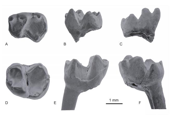 道森曙猿(新种)Eosimias dawsonae,new species 1995年5月9日发现于垣曲县前坪村(北纬35度02分18秒,东经111度47分96秒),采集的化石标本为齿根或齿槽的左齿骨残段,齿根和齿槽的状态表明,这个牙齿着生时的倾向与齿列的其它部分一样是典型的曙猿属形态。保存下来的两个臼齿的齿冠布满小裂痕,但其形态学特征与中华曙猿和世纪曙猿非常相近。曙猿属下颌骨远深于大致同等体形的早期附猴型类和兔猴型类的特点更加支持了曙猿属的类人猿类地位,因为类人猿类的下颌骨比原猴类更深更粗壮、齿骨部分以其巨大的深度和相对的粗壮而引人注目,依据道森曙猿各种比值,并参照中华曙猿和世纪曙猿相关比值,推测其体重范围为107-276克,是目前已知体型最大的曙猿属物种,鉴于玛丽道森博士对北半球始新世脊椎动物知识作出的重要贡献,该曙猿被命名为道森曙猿。