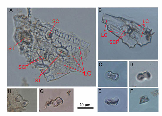 图2 马鬃龙特殊结构中保存的植物表皮和植硅体 (A,B含有短细胞对的表皮细胞; CHG 哑铃型植硅体; DEF属于C植硅体不同侧面)(吴妍供图)