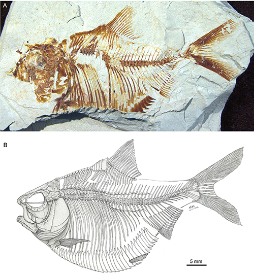 图二 冀望突尼斯鲱正模标本(A)及骨骼复原图(B)。供图:吴飞翔