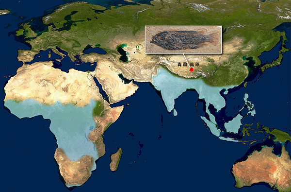 图1. 现代攀鲈分布区(蓝色)及青藏高原攀鲈化石产地(红圆)。化石为西藏始攀鲈正模标本,现存于中科院古脊椎动物与古人类研究所(吴飞翔供图)