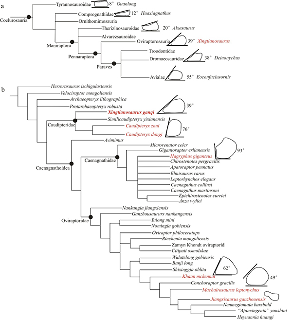 图2 (a) 虚骨龙类桡腕骨角度演化;(b) 窃蛋龙类系统发育结果及桡腕骨角度演化,红色为具有桡腕骨角度测量数据的窃蛋龙类物种(裘锐供图)