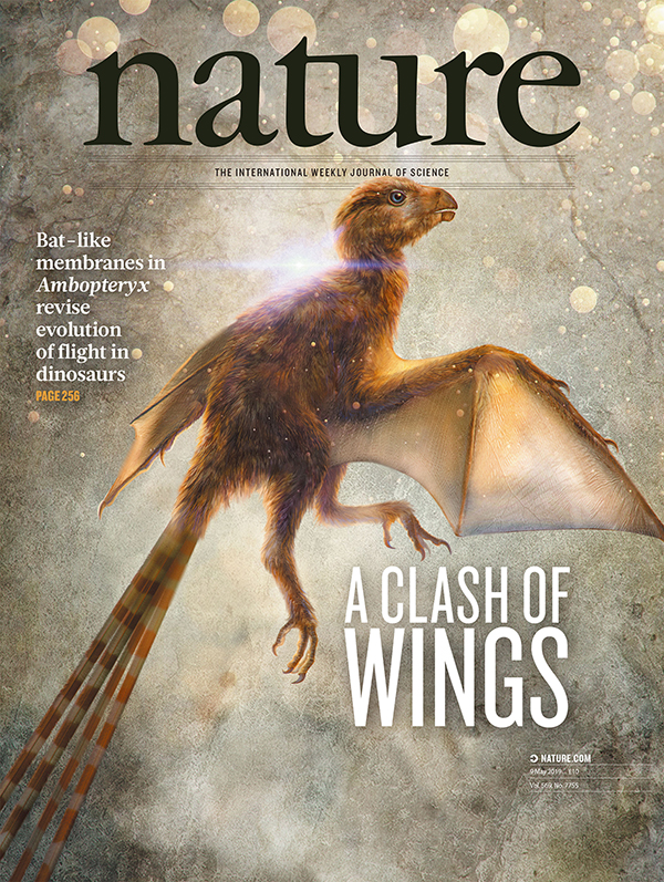 图1. 《自然》当期杂志封面:古脊椎所发现侏罗纪具膜质翅膀的恐龙