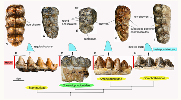 图2 豕脊齿象科和其它象类的形态学对比(A&B, 玛姆象类;C–E, 豕脊齿象类;F&G, 铲齿象类;H&I, 嵌齿象类) (李春晓 供图)