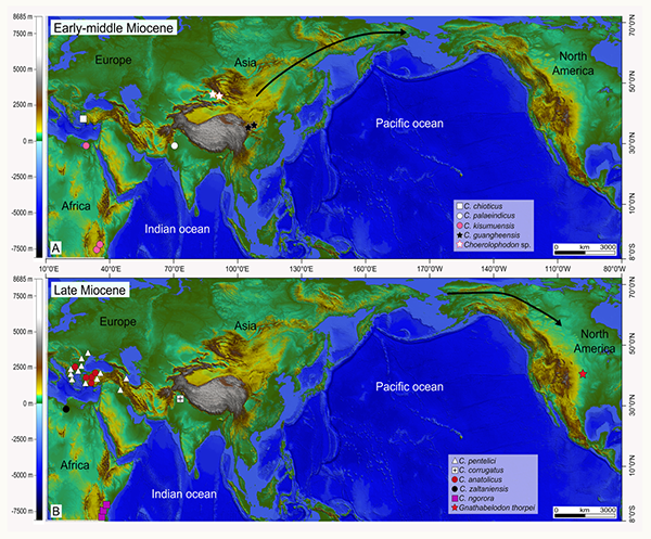 图3 豕脊齿象类在中新世的分布位置以及洲际之间迁移示意图 (A, 早—中中新世;B, 晚中新世)(李春晓 供图)