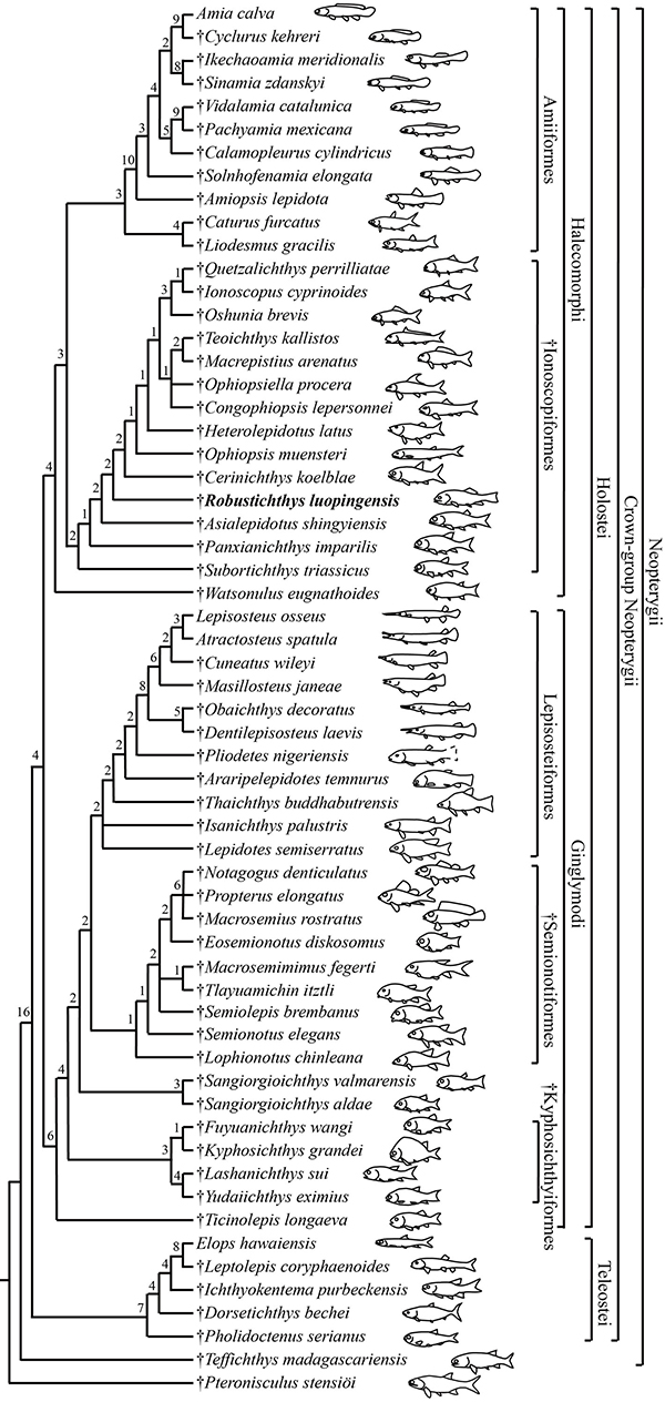 全骨鱼类分为铰齿鱼类和近鲱形类,分别以雀鳝和弓鳍鱼为现生代表。由于全骨鱼类与真骨鱼类(现生脊椎动物中最大的类群)的姐妹群关系,全骨鱼类在新鳍鱼类乃至整个辐鳍鱼亚纲的研究中具有举足轻重的地位。罗平强壮鱼是云南罗平生物群中体型最大的一种全骨鱼类,全长可达40厘米,发现于云南罗平中三叠世安尼期(2.44亿年前)海相地层。现已查明,它也是世界范围内中三叠世(距今2.37-2.47亿年前)地层中所发现的最大的全骨鱼类属种,对于重建三叠纪海洋脊椎动物生态环境无疑具有重要的潜在价值。自2014首次报道并命名以来,罗平强壮鱼成为全骨鱼类研究中备受关注的化石物种。然而,不尽如意的是,因为最初化石数量较为稀少,一些关键的骨骼特征不清楚导致罗平强壮鱼在全骨鱼类中的系统分类位置成为争论不休的问题。一些研究者认为它是近鲱形类的成员,但另外一些研究者将它归入铰齿鱼类。
