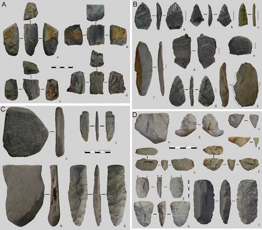 图2 桦阳和桃山遗址过渡阶段出土的石制品。A-C)桦阳遗址第2文化层;D)桃山遗址第3层(岳健平 供图)