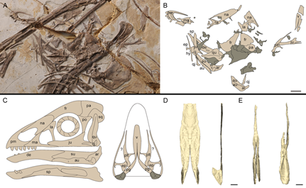 自19世纪鸟类的头骨可动性被发现以来,研究者们便对其相关的机制、演化、分异和功能大加关注。鸟类头骨可动性可能具有以下功能:扩大口裂的范围,加快喙部闭合打开的速度,提高头骨吸收冲击力的能力,提高取食的准确性。这一特性主要通过相对灵活的颧弓、方骨和腭区骨骼共同实现:方骨向前后方向移动时将推力传递给可动的颧弓和腭区骨骼,从而实现部分上颌相对于脑颅的上抬。腭区的翼骨-腭骨-犁骨系统可以从头骨后部向前部传递推力,因此在头骨可动性的实现中具有重要作用。由于早期鸟类极少保存有腭区骨骼,关于鸟类头骨可动性的起源及早期演化此前均知之甚少。