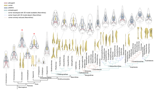 Evolution of the vomer and its implications for cranial kinesis in Paraves》的研究成果。他们对会鸟(Sapeornis)和中国猎龙(Sinovenator)的头骨进行了高精度CT扫描,并对腭区重要组成部分——犁骨进行了三维重建,提供了关于早期副鸟类腭区的重要形态学信息。