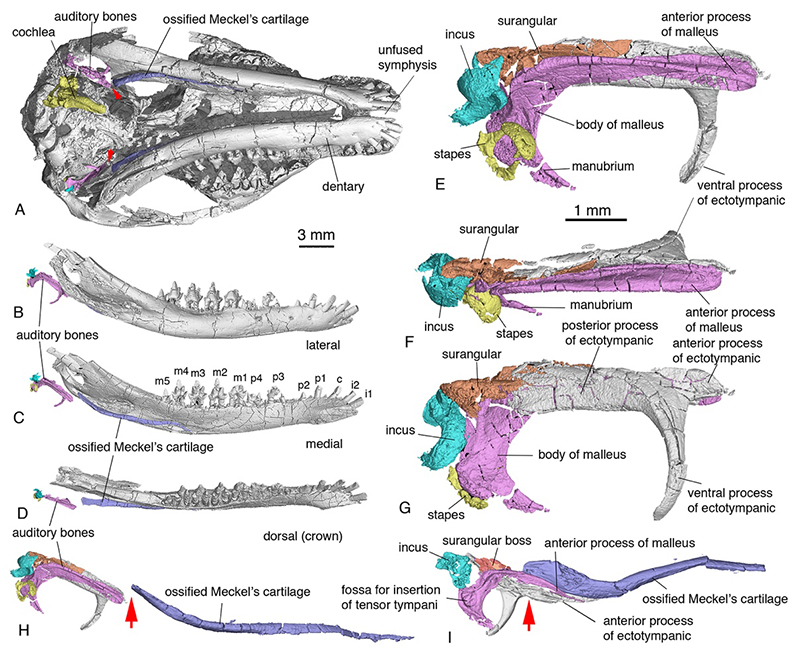 图三. 李氏源掠兽中耳、内耳、麦氏软骨的形态和解剖学位置。H, 箭头指向听骨与麦氏软骨分离点。I,箭头指向辽尖齿兽过渡型中耳听小骨和麦氏软骨的骨连结 (毛方园 供图)