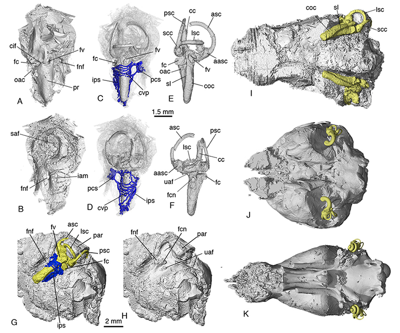 图四. 李氏源掠兽内耳结构与脑腔形态及相对关系(A-I),以及与单孔类(J)、有袋类(K)的比较。黄色为内耳结构的内模,蓝色为内耳相关血管系统 (毛方园 供图)