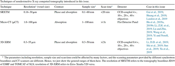 专辑共收录了15篇文章,其中包括13篇原创研究论文,1篇前言和1篇评论文章,除CT成像技术的应用之外,还包括了提高CT成像质量、三维打印等方法技术上的应用。前言中简要介绍了X射线在古生物学领域的应用简史和虚拟古生物学的概念。13篇研究论文涵盖了微体古生物学(Huang et al. 2019; Shi et al. 2019)、古无脊椎动物学(Neubauer et al. 2019; Yu et al. 2019)、古脊椎动物学(Gai et al. 2019; Hu et al. 2019a,b; Li et al. 2019; Lu and Zhu 2019; Yi and Norell 2019)、古植物学(Landon et al. 2019)、遗迹学(Wang et al. 2019)和早期生命演化(Li et al. 2019; Sun et al. 2019)等古生物学研究的诸多领域,涉及的X射线三维无损成像技术包括高分辨率显微CT技术、同步辐射显微断层成像技术、以及新型X射线三维显微镜技术(结合了光学放大和CCD技术而有别于单纯依赖几何放大和FTP技术的传统显微CT)。