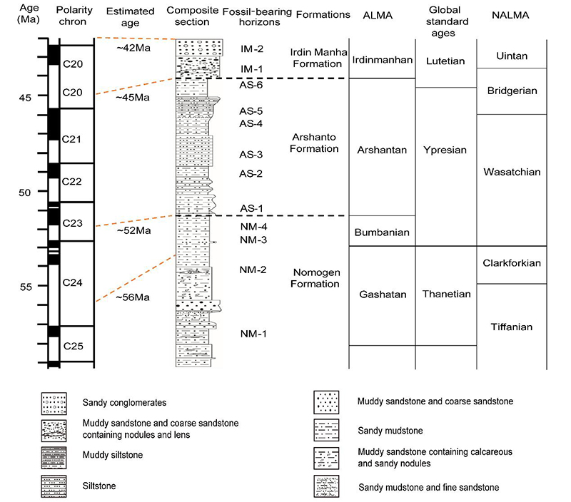 图1 二连盆地东部古近纪地层、磁性柱、哺乳动物层位及其国际对比