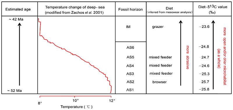 用于研究的化石材料是多年野外考察中采自二连盆地呼和勃尔和地区早-中始新世阿山头组和伊尔丁曼哈组,时间跨度为距今52-42百万年。研究人员对多个化石层位的141颗施氏貘(Schlosseria magister)和脊齿貘(Lophialetes expeditus)的上第二臼齿(M2)进行了牙齿中痕分析,结果表明其食物结构逐渐变“粗”,从取食鲜嫩植物的“嫩食型”逐渐过渡为取食粗硬植物的“粗食型”。对137颗施氏貘和脊齿貘的牙齿进行的稳定碳同位素测试分析结果表明,施氏貘和脊齿貘均以C3植物为食(纯C3饮食),这印证了目前国内外学者普遍认为的陆地生态系统在晚中新世之前以C3植物为主的观点;更有意思的是,稳定碳同位素分析还表明,随着时间的推移(从距今约52百万年到距今42百万年),脊齿貘类的栖息环境也逐渐变得相对开阔和/或干旱。经过综合分析,研究人员认为,两种脊齿貘类的食物结构变化(逐渐变“粗”)、栖息环境变化(逐渐开阔和/或干旱)与全球气候变化(降温趋势)三者呈现出一定的响应关系,即早始新世气候适宜期(EECO)之后全球持续性的降温对陆地生态系统产生了一定的影响,二连盆地呼和勃尔和地区的生态环境朝着相对开阔和/或干旱的方向发展,在一定程度上响应了这种全球的降温趋势,而该地区的生态环境变化也造成了植被类型和分布发生变化,从而影响到哺乳动物的演化。最终,由于施氏貘和脊齿貘两者对生态环境变化的适应能力不同,施氏貘在距今约45Ma时灭绝,与此同时其姐妹群脊齿貘出现并迅速繁盛。