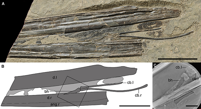 图1 第一件保存有基舌骨的翼龙化石(IVPP V 14189),比例尺分别为50 mm,50 mm和10 mm。