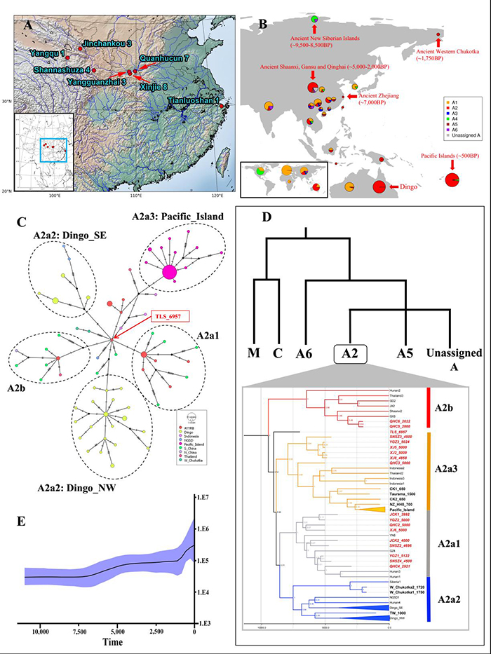 图1 (A)采集的古代样品分布情况;(B)单倍型A的几种亚型在中国、东南亚、太平洋岛屿上的组成情况;(C)以A2单倍型构建的邻接法网络关系图,浙江田螺山的个体处于中心位置,代表A2单倍型的基础类群;(D)以单倍型A构建的贝叶斯系统进化树A2单倍型部分;(E)贝叶斯种群增长图。(张明供图)