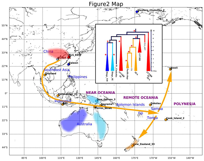 图2 红色区域代表了澳洲野犬、新几内亚歌唱犬和殖民时代之前的太平洋家犬的可能起源地。(张明供图)