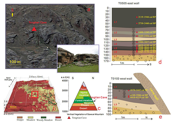 图2. 研究点与研究区域概况,a. 通天洞遗址照片, b. 通天洞遗址周边植被分布特征c.萨乌尔山垂直植被特征,d. T0505探方地层与AMS14C年代分布,T0103探方地层与AMS14C年代分布(周新郢供图)