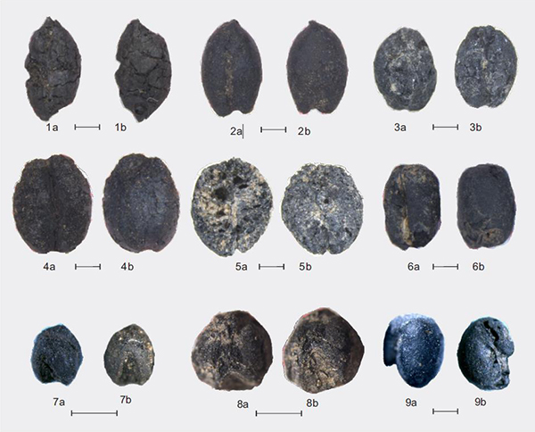 图3. 通天洞遗址出土炭化作物 1. Hordeum vulgare var. nudum (T0505-9. 5295-5046 cal yr