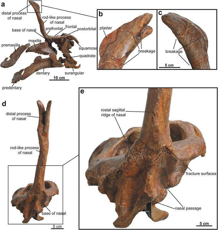 图1 棘鼻青岛龙头骨,显示其特殊的“棘鼻”状头饰以及鼻骨根部断裂处