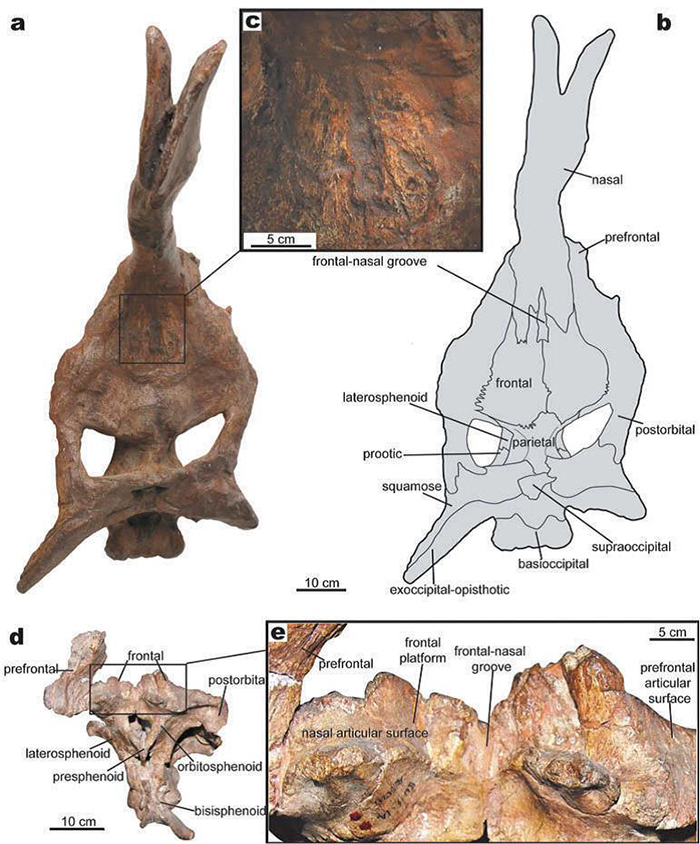 此次研究还发现了棘鼻青岛龙鼻骨的另外一个形态学特征,在鼻骨根部也分成两支,有一个窄条状结构夹于其中,无论外部观察还是CT扫描均显示这一结构与周围的鼻骨和额骨均有明显界限,且密度也有所不同。CT扫描还显示其矢状面向腹侧变小,近似于半圆形,其尾部与棘鼻青岛龙更年轻的副型头骨的两个额骨的鼻骨关节面中间的裂隙相似,认为这一结构为一个被沉积物填充的窄沟,是从鸭嘴龙超科基干类群和一些较原始的赖氏龙亚科成员所具有的额骨鼻骨囟(frontal-nasal fontanelle)演化而来,而并非此前学者认为的额骨前突。