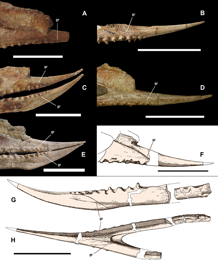 图3. 魏氏准噶尔翼龙上下颌细长尖锐上翘无齿的吻部及附着角质外套的沟状印痕