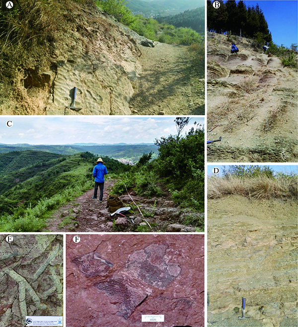 A. 关底组I段; B. 关底组Ⅱ段; C. 关底组Ⅲ段; D. 关底组Ⅳ段; E. 关底组Ⅲ段下部粗大虫管遗迹化石; F. 关底组Ⅲ段中部盾皮鱼类化石