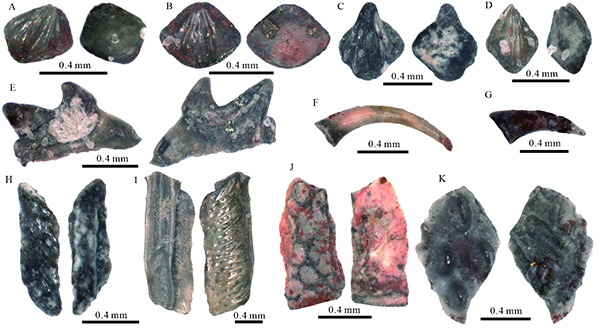 A-E. 棘鱼类,其中A、B为栅棘鱼类背棘鱼未定种1(Nostolepis sp. 1),C为栅棘鱼类背棘鱼未定种2(Nostolepis sp. 2),D为栅棘鱼类背棘鱼未定种3(Nostolepis sp. 3),E为锉棘鱼类下颌;F-G. 硬骨鱼类牙齿;H-I. 硬骨鱼类斑鳞鱼(Psarolepis)鳞片;J. 无颌类不完整骨片;K. 盾皮鱼类不完整骨片