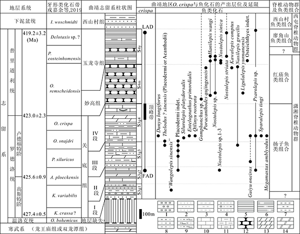 该研究团队取得的主要进展包括:(1)曲靖地区的关底组是一套以细碎屑岩为主的滨浅海相红层沉积,在曲靖周边广泛出露于下寒武统龙王庙组或中寒武统双龙潭组之上、以浅灰色瘤状灰岩夹页岩为主的妙高组之下(图1);(2)根据岩性变化特征将关底组划分为四段,从下往上依次为I段岳家山段、Ⅱ段崇家湾段、Ⅲ段彩莲段及Ⅳ段东坡段(图2),曾从其下部划分出的岳家山组一名应予以废弃;(3)关底组Ⅱ段崇家湾段中门类齐全且丰富的鱼类化石(主要包括无颌类、盾皮鱼类、棘鱼类、硬骨鱼类的鳞片、牙齿以及碎骨片,并以棘鱼类、硬骨鱼类的鳞片及牙齿等鱼类微体化石为主,图3)的新发现,为关底组的时间下限提供了可靠的古鱼类学证据,依据其中栅棘鱼类背棘鱼(Nostolepis)的全球对比分析研究,在结合对牙形类等无脊椎动物化石的研究进展及新认识的基础上,认为关底组崇家湾段的时代应为志留纪罗德洛世高斯特晚期、含有“中华王氏鱼”(Wangolepis sinensis)的关底组岳家山段中上部的时代应为志留纪罗德洛世高斯特早期,而不含鱼化石的岳家山段下部目前并不排除可下延到温洛克世的可能;(4)通过棘鱼类微体化石的全球对比,关底组上覆地层妙高组可归入到志留系普里道利统下部,这与关底组Ⅳ段东坡段中牙形类Ozarkodina crispa顶峰带指示关底组时代上限为志留纪罗德洛世最晚期是一致的(图4);(5)曲靖地区关底组的地质时代主要限于志留纪罗德洛世,这也是潇湘脊椎动物群中扬子鱼类组合的主要分布时限(图4)。