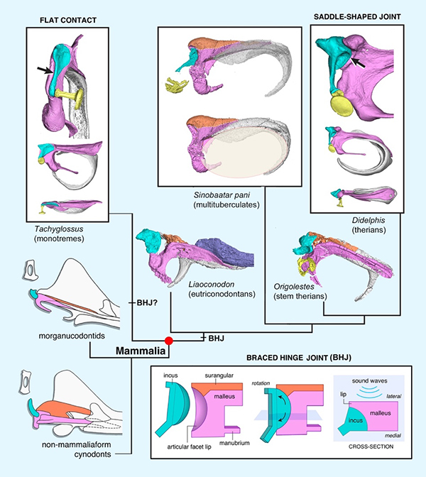 哺乳动物中耳的演化,是一个从达尔文时代就在广泛探讨的问题,也是脊椎动物渐进演化的经典案例。爬行类具原始颌关节(primary jaw joint),由下颌关节骨与头骨上的方骨构成,中耳只有一块听骨(镫骨=耳柱骨)。与此相比,哺乳动物中耳则由锤骨、砧骨、镫骨形成听骨链,外鼓骨支撑鼓膜收集声音,下颌由一块齿骨构成,形成齿骨-鳞骨颌关节。解剖学、发育生物学、遗传学的大量研究证明,哺乳动物的听骨和爬行动物的齿骨后骨和方骨具有同源关系。古生物学也早已提出中耳渐进演化假说,即从爬行类向哺乳动物的典型哺乳动物中耳的演化过程中,齿骨后骨逐步缩小,并与齿骨分离,最终移入颅基部,成为专司听觉功能的结构。但纤细的听骨很难保存为化石,近两百年来发现的中生代哺乳动物中耳化石极少,其形态细节和关节方式一直不清楚,对其演化过程和机制的解释存在极大的人为性,各种推论、假说存在较大争议。