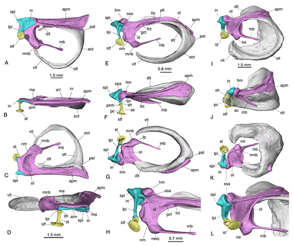 图三、哺乳动物中耳演化的祖先表型与过渡型固枢关节(研究团队 供图)