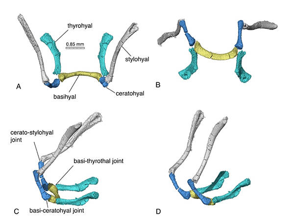除了完好的听骨外,潘氏中国中华俊兽也保存了迄今最完整的中生代哺乳动物舌骨悬器。通过CT扫描重建的方式,舌骨悬器首次以三维形态呈现。这一舌骨悬器由单根的基舌骨,成对的角舌骨、茎舌骨和甲舌骨,组成类似现生哺乳动物的鞍状舌骨结构。灵活的关节模式表明多瘤齿兽此时已具有吞咽和吸吮的可能性。