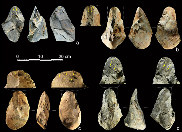 图3 百色盆地以大石片为毛坯的手斧标本,黄色箭头指示打击方向(供图 李浩、雷蕾)