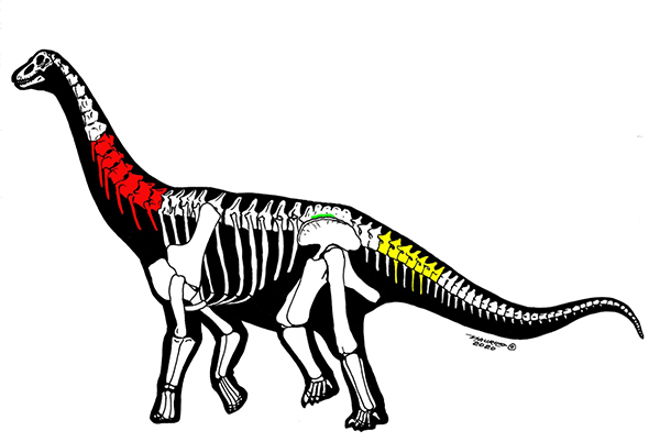 红色(颈椎):中国丝路巨龙;黄色(尾椎):新疆哈密巨龙;绿色(荐椎):未命名化石