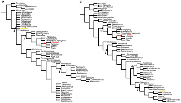 (A) 中国丝路巨龙和新疆哈密巨龙作为单一分类单元;(B)中国丝路巨龙和新疆哈密巨龙作为两个独立的分类单元。1. Titanosauria,2. Colososauria,3.Lithostrotia