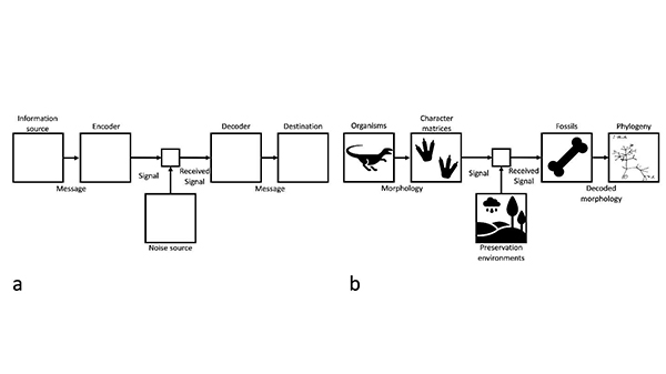 香农认为通信中最基础的问题是在一处近似或者精确地重现另一处的消息,类似的,我们认为古生物学中最基础的问题是在现代近似或者精确地重现在地质年代中的古生物,包括他们的演化历史与形态功能等诸多方面。在古生物学系统发育研究中,绝大多数研究只能依靠形态学数据,与此相反的是,在现代生物或者最近灭绝的生物的系统发育研究中,研究人员可以利用DNA或者蛋白质序列这样易于数字化的数据。因此,DNA或者蛋白质序列非常接近于现代通信系统中的数字信号,而形态学数据更接近于模拟信号。形态学的数字化通常依靠形态学特征矩阵来完成,但是如何选择特征,每个特征中有多少信息量,各个特征之间的相关性,这些问题都是模糊不清的。