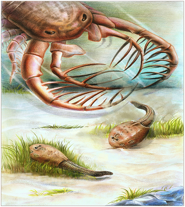 图3.一只巨大混翅鲎准备捕食无颌类骨甲鱼(引自盖志琨、朱敏,2017,郭肖聪绘)