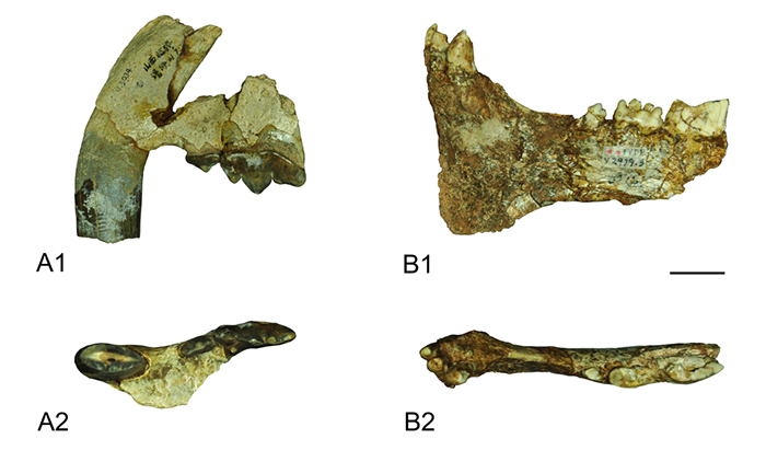 图1 新修订的意外巨颏虎(A潘侯村材料,B 公王岭材料)