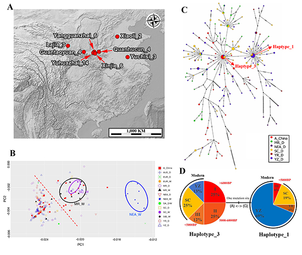 图1:A. 样品分布图;B. 所有古代样品和现代样品的主成份分析图;C. 网络结构图;D. 同时具有古代和现代的2个单倍型
