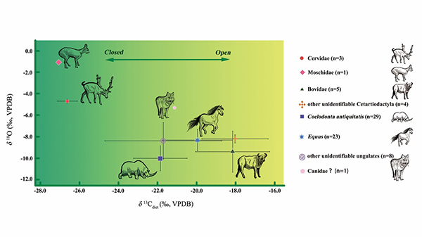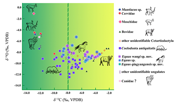 图2.麻地沟遗址动物群δ13C和δ18O值分布散点图(徐哲供图)