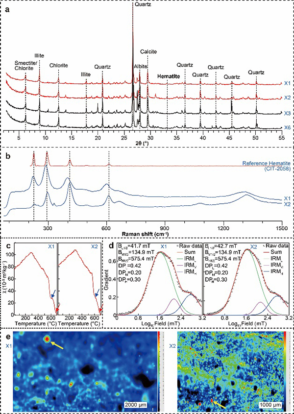 图3. 染色区及遗址内其他区域沉积物的矿物学特征对比。样品X1和X2来自染色区,X3和X4来自非染色区。a,X射线衍射(XRD)分析结果;b,拉曼光谱分析结果;c,磁化率随温度变化特征;d,矫顽力谱分析结果;e,微束X射线荧光光谱(microXRF)分析结果。上述多指标分析揭示出,染色区沉积物含有大量粗颗粒赤铁矿,结合考古学证据可以确定,这些粗颗粒赤铁矿为人类加工颜料过程中产生的遗存。(研究团队提供)