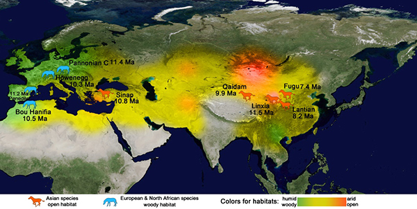 图3 晚中新世早期旧大陆三趾马动物地理与生态环境