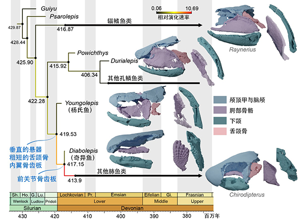 肺鱼类从一出现便显示出高度的特异性,并且多样性非常高,被认为在演化阶段初期经历了快速演化。本项工作采用贝叶斯末端定年法定量地分析了古生代肺鱼类的系统发育关系、分化时间及特征的演化速率,分析结果支持了以上假说(图4)。肺鱼类在志留纪晚期至早泥盆世洛赫考夫期末之间一个约7百万年的窗口期起源并经历了快速演化,尤其是与取食相关的特征明显比其他特征具有更高的演化速率。