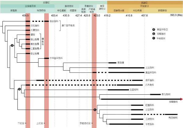 图3 盔甲鱼类的系统发育关系与地史分布图(山显任供图)