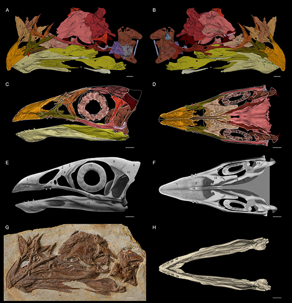 热河鸟是除了始祖鸟以外,唯一具有骨质长尾的原始鸟类,基干的分类位置和独特的身体结构令其一经发现便世界闻名。然而虽然已有众多标本发表,但由于标本的压扁保存和传统研究方法的局限,人们对于热河鸟的头骨形态其实知之甚少。在此项新研究中,研究人员利用先进的三维扫描和重建手段,在这件保存精美的热河鸟头骨标本上获取了大量新的形态学信息,发现热河鸟的头骨整体极为原始,唯独喙部相当特化。