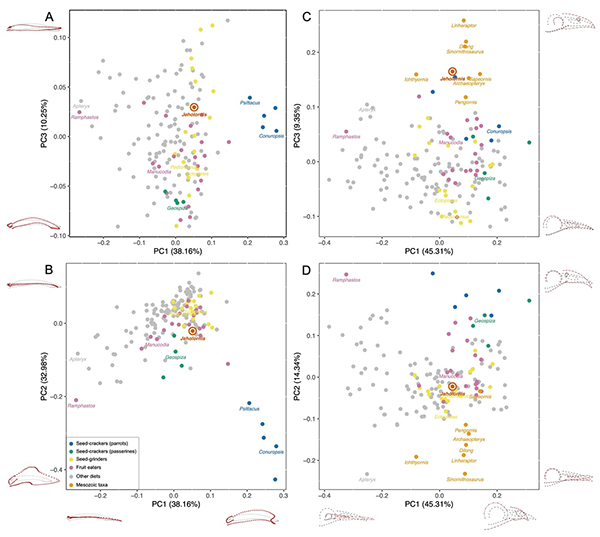 热河鸟在自发现以来,一直被认为是吃种子的鸟类,主要依据是其腹部保存的种子残余,以及看上去较深(或称较高)的下颌——人们认为这一深下颌看上去形似鹦鹉等取食种子的现生鸟类。在此项新研究中,研究人员抽取了现生鸟类包括食果、食谷等不同食性的代表物种进行了三维扫描重建,同时加入基于新标本重建的热河鸟数据,进行了针对下颌的三维几何形态分析和针对头骨的二维几何形态分析。分析结果显示热河鸟并没有此前人们认为的深下颌,与能够磕开种子的食谷鸟类尤其是鹦鹉等,在形态空间中明显相区别,因此排除了其磕开取食种子的可能性。