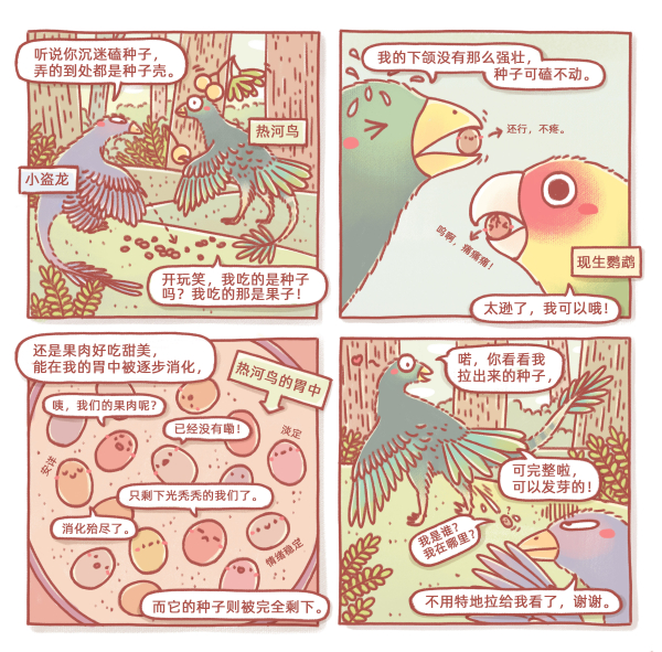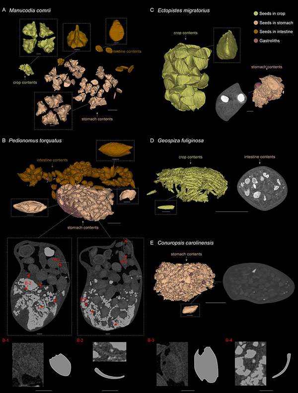 为了验证另一种食谷的可能性——利用胃石消化种子,研究人员对食果和使用不同策略取食种子的现生鸟类进行了整体三维扫描,揭示出了它们的胃容物在体内时的不同状态。结果显示,利用喙部处理种子的鹦鹉等鸟类胃容物中种子的形态已完全破碎而不可辨认,利用胃石消化种子的鸟类腹中种子整体形态仍在,但都具有不同程度的破损;同时,种子和胃石相互混合,粘结紧密。相比之下,热河鸟保存的种子则缺乏这样的破损,同时保存更加松散,也从未与胃石同时保存,更接近食果鸟类腹中种子的状态。