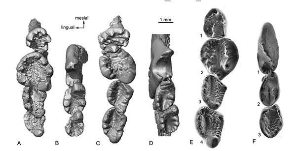 图1. 三类贼兽左侧上下齿列对比,其中E-F齿列中的牙齿曾经归入四个属种