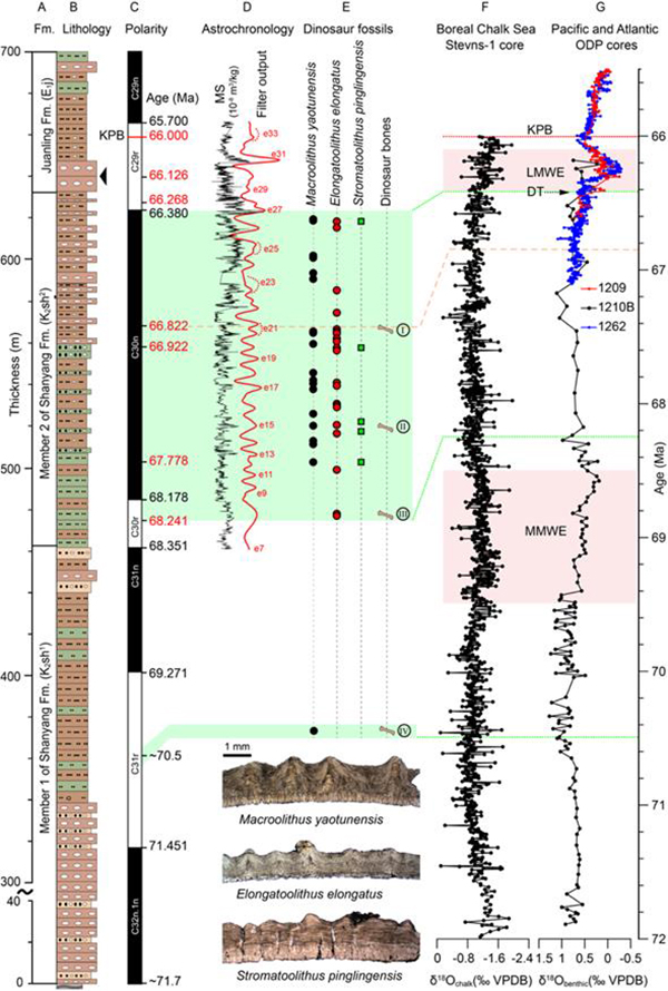 图2 图中表示的是山阳盆地的岩性柱(A和B)、磁极性序列(C),天文调谐结果(D)、恐龙化石分布(E)以及海洋氧同位素记录在白垩纪末期的变化(F和G),指示盆地内的恐龙在其灭绝前的200万年间多样性很低,且古气候、尤其是温度的变化对恐龙的多样性有着重要的影响 (作者 供图)