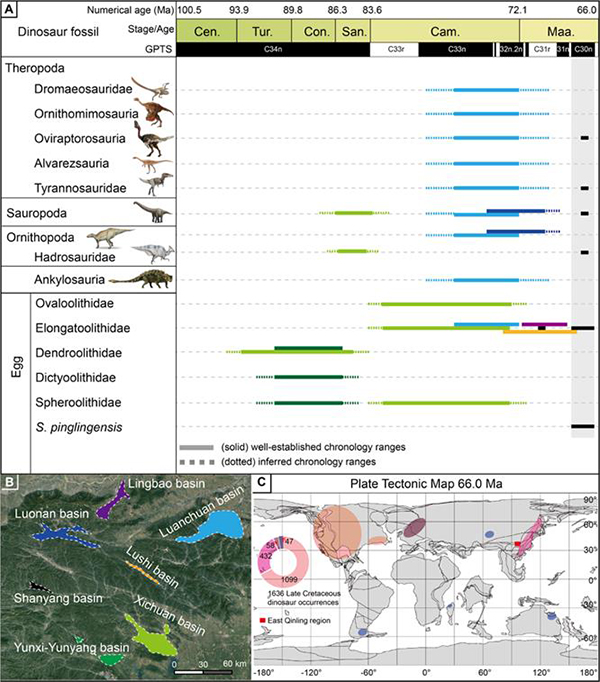 年代学结果显示山阳盆地恐龙化石分布的时限是6824万年到6638万年前,表明山阳盆地内的恐龙多样性在其灭绝前的约200万年间一直处于比较低的水平。综合秦岭东部其他晚白垩世盆地,以及山东莱阳、广东南雄等地发现的恐龙化石,研究人员发现在7200万年前后中国的恐龙多样性有一个明显的降低趋势,这与北美西部的恐龙化石分布特征有相似之处,因此该研究认为恐龙多样性在晚白垩世的降低很可能是一个全球性现象(图3)。