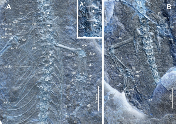 图2 美丽莫旗蜥 (Moqisaurus pulchrum gen. et sp. nov.)副型标本(IVPP V25137)的肩带和前肢(A)、腰带和后肢(B)